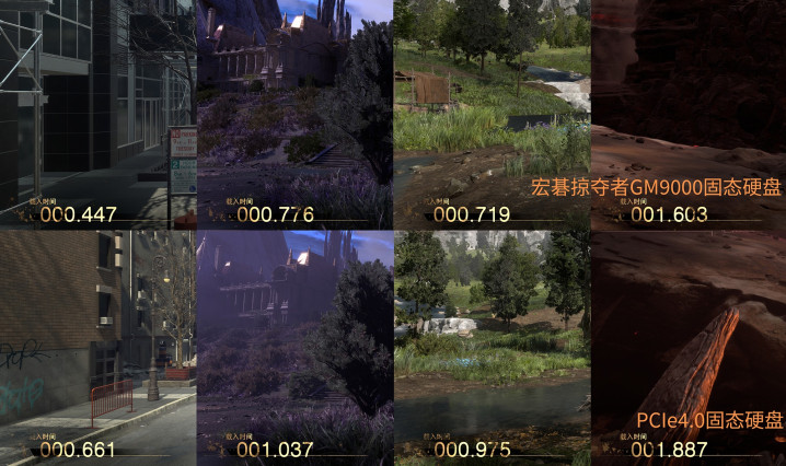 固态硬盘在读写方面的优势可体现在实际游戏场景,《魔咒之地Forspoken》游戏内置基准测试功能,可测试每个场景载入时间,将游戏同时安装于宏碁掠夺者GM9000固态硬盘与PCIe4.0固态硬盘中,游戏画面设为4K分辨率与最高等级画质,选四个不同游戏场景进行统计,游戏数据存放于宏碁掠夺者GM9000固态硬盘中的载入时间平均能减少25%,比如第一个场景载入时间能缩短超过32%。
