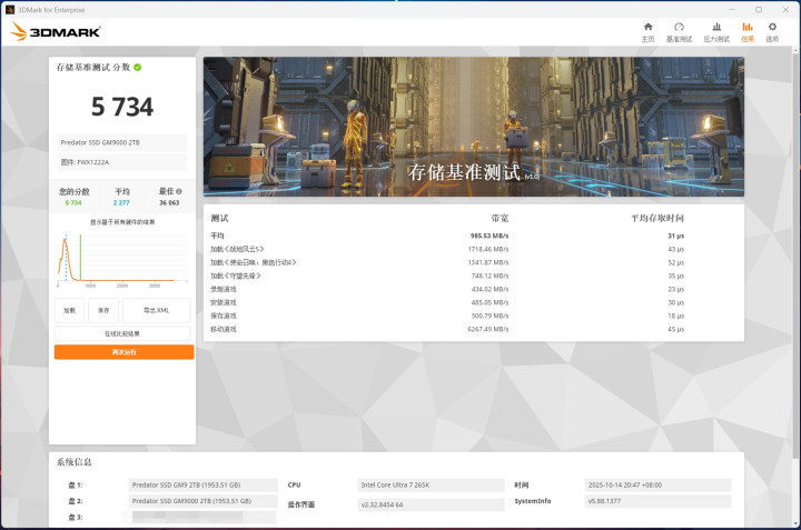 3DMark基准性能测试软件中的存储基准测试项目,宏碁掠夺者GM9000固态硬盘的综合得分为5734,平均带宽为985.53MB/s,平均存取时间为31μs,子项加载《战地风云5》游戏时带宽为1718MB/s,移动游戏带宽为6267MB/s,前不久测试过一款PCIe4.0规格的固态硬盘,它在该测试项目成绩也就4000分。