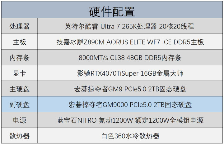 接下来对宏碁掠夺者GM9000 PCIe5.0 2TB固态硬盘进行性能测试,在硬件配置方面,处理器为Intel Ultra7 265K,技嘉Z890M DDR5冰雕主板,影驰RTX4070Ti Super 16GB金属大师显卡,8000MT/s CL38 48GB DDR5内存条,主系统盘为宏碁掠夺者GM9 PCIe5.0 2TB固态硬盘,操作系统为Windows 11 24H2版本。