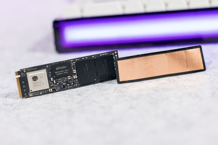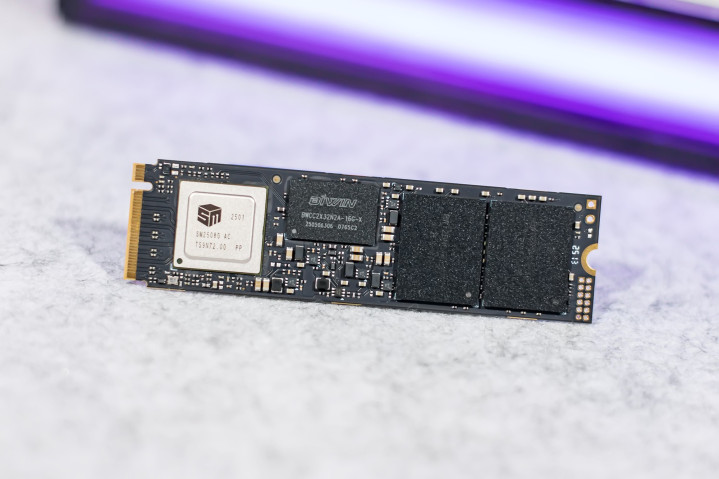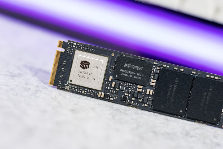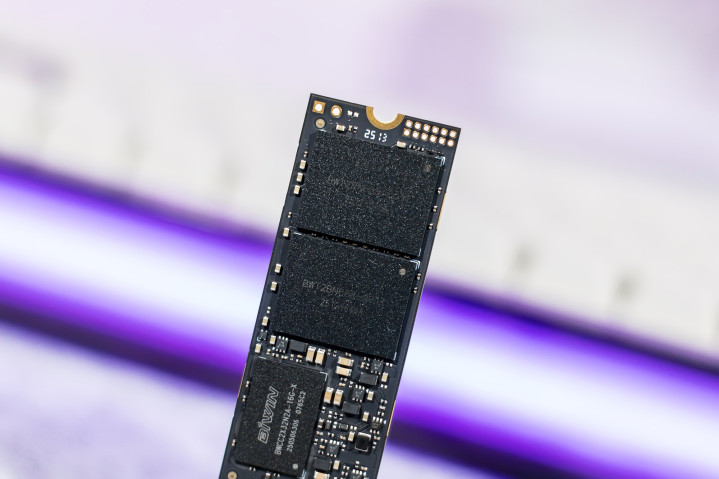 宏碁掠夺者GM9000固态硬盘搭载来自慧荣SMI的SM2508主控芯片,其基于台积电6nm制程工艺打造,采用8通道32CE设计,集成四颗ARM Cortex-R8核心,支持PCIe 5.0×4传输接口与NVMe2.0标准协议,支持3600MT/s闪存接口速率,理论持续读写速度分别可达14.5GB/s与14GB/s,主控右侧为独立DRAM缓存芯片,其丝印编号为BWCC2X32N2A,容量为2GB的LPDDR4内存颗粒。