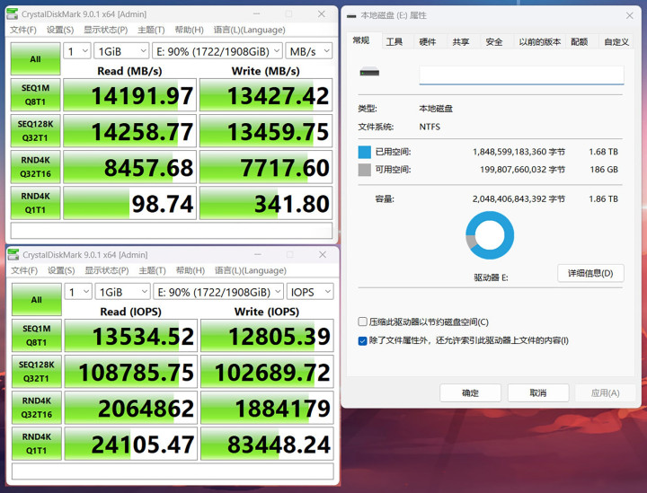 接下来将宏碁掠夺者GM9000固态硬盘的存储空间填充到90%,继续测试其在90%空间占用率下的读写性能表现,实测此时读写速度分别为14191MB/s与13427MB/s,4K单线程读写速度分别为98.74MB/s与341.8MB/s,与空盘状态相比并没有出现读写性能下降。