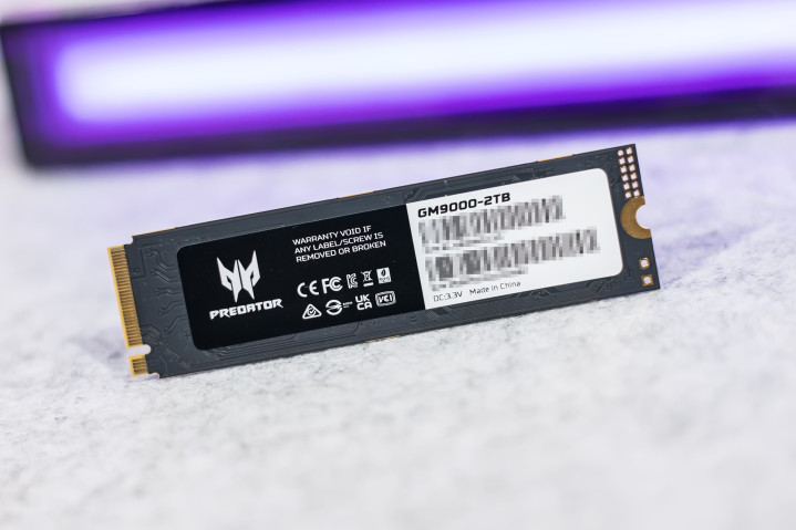 位于固态硬盘背面仅设有一张标签纸,上面印有品牌型号与认证标识,还有产品SN序列号条形码,厂商为宏碁掠夺者GM9000 2TB固态硬盘提供五年或1600TBW质保售后服务,哪怕每天写入800GB数据持续五年仍未超出标称TBW值,4TB容量版本的总写入数据量甚至达到3200TBW,高于市面上大部分PCIe5.0固态硬盘。