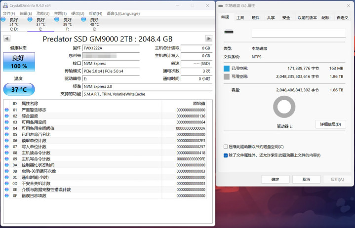 接下来的性能测试默认在英特尔酷睿Ultra7 265K硬件平台上进行,除非另有说明,先利用CrystalDiskInfo软件查看宏碁掠夺者GM9000固态硬盘状态信息,显示固态硬盘支持NVMe 2.0协议标准,当前运行在PCIe5.0×4传输模式中,待机温度为37℃,固态硬盘的总容量为2048.4GB(10进制),用户实际可用存储空间为1.86TB(8进制)。