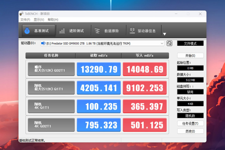 TxBENCH基准性能测试软件,先运行基准测试项目,全盘写入的进阶测试稍后再测试,实测宏碁掠夺者GM9000固态硬盘的顺序读写速度分别为13290MB/s和14048MB/s,4K单线程随机读写速度分别为100.235MB/s与365.397MB/s。