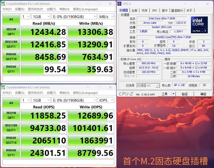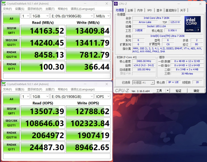 回到英特尔酷睿Ultra7 265K+Z890M主板平台,实测宏碁掠夺者GM9000固态硬盘的顺序读取写入速度分别为14163MB/s与13409MB/s,4K单线程的读写速度分别为100.3MB/s与366.44MB/s,4K随机读写IOPS分别为2064K与1907K,在AMD/Intel两个硬件平台上均能达到标称的顺序读写速度, 4K随机读写均高于标称值2000K与1600K。