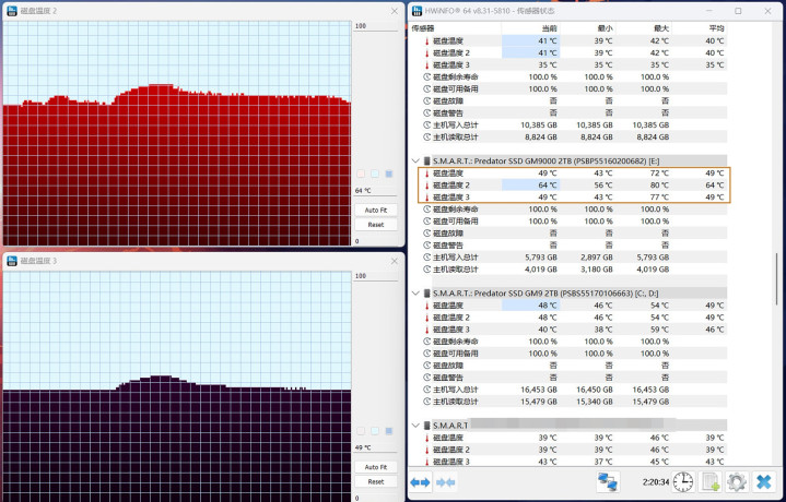 最后是运行温度测试,宏碁掠夺者GM9000固态硬盘提供了三个温度传感器数据,第二个应该是主控芯片,其它两个应该是闪存颗粒,测试期间环境温度为28℃,并搭配铝合金散热模块辅助散热,通过软件记录全盘写入期间的温度,显示峰值温度为80℃,假如将金属散热模块给拆了下来仅使用自带的散热片,在游戏场景下测出来的最高温度为70℃。