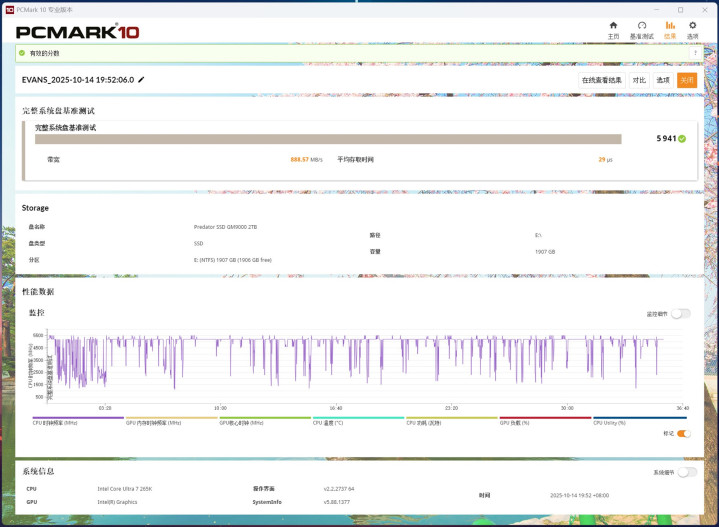 在PCMark10基准性能测试软件中的完整系统盘基准测试,完整测试所有应用程序启动与数据加载等项目,可以反映固态硬盘作为主系统盘的表现,宏碁掠夺者GM9000固态硬盘在该项目中获得成绩为5941分,带宽为888.57MB/s,平均存取时间为29μs。