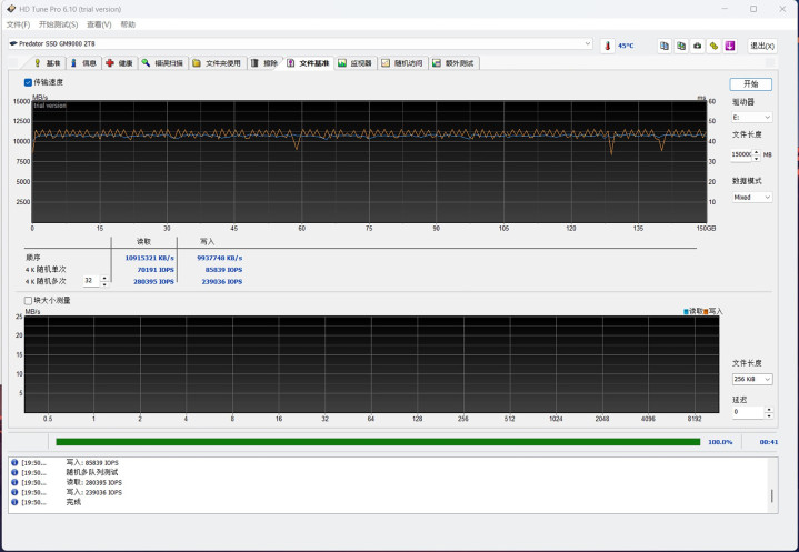 HD Ture Pro基准性能测试软件中的文件基准测试项目,本次将文件长度设为150GB,Mixed混合数据模式,相当于往固态硬盘分别读写一个大小为150GB数据文件,实测读取速度为10915MB/s,写入速度为9937MB/s,整个读写曲线非常平稳。