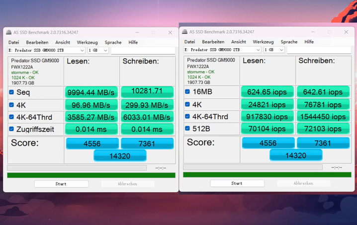 AS SSD Benchmark基准性能测试软件,实测宏碁掠夺者GM9000固态硬盘的顺序读取写入速度分别达到9994.44MB/s与10281.71MB/s,而4K单线程读写速度分别为96.96MB/s与299.93MB/s,读写延迟均为0.014ms,总成绩为14320分。