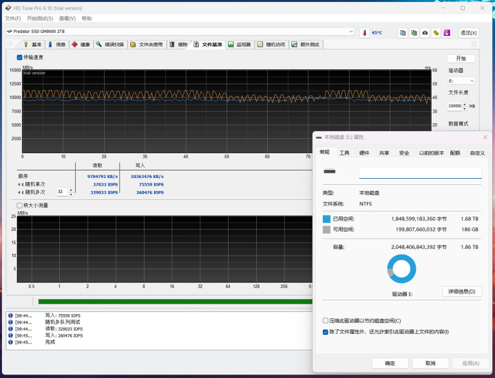 HD Ture Pro软件的文件基准测试,本次将文件长度设为100GB,Mixed混合数据模式,这相当于一次性往固态硬盘中分别读写剩余存储空间一半的文件数据,实测读取写入速度分别为9784MB/s与10363MB/s,无论是顺序读写还是随机读写的测试结果,均与空盘状态基本一致。