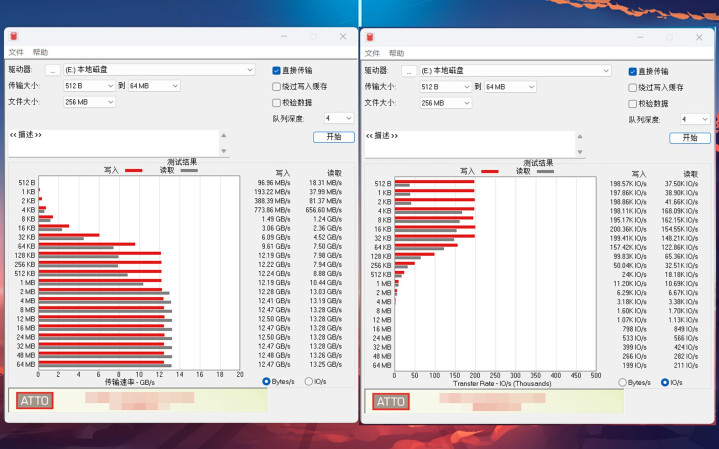 ATTO Disk Benchmark基准测试软件,在队列深度设定值为4时,实测宏碁掠夺者GM9000固态硬盘读取写入速度分别可达13.28GB/s与12.5GB/s,4K大小数据包时读取写入速度分别为656.6MB/s与773.86MB/s当文件大小为128KB或以上达到满速写入,读取速度需要在文件大小为2MB之后达到峰值。