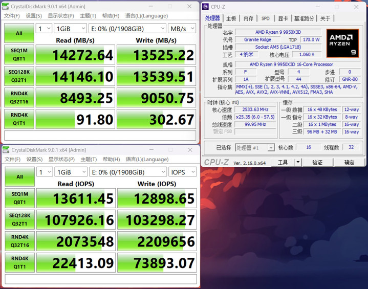 基准性能测试,先在AMD锐龙9 9950X3D处理器+B850M主板上进行性能测试,实测宏碁掠夺者GM9000固态硬盘的顺序读取速度为14272MB/s,顺序写入速度为13525MB/s,4K单线程读写速度分别为91.8MB/s与302.67MB/s,4K随机读写IOPS分别为2073K与2209K。