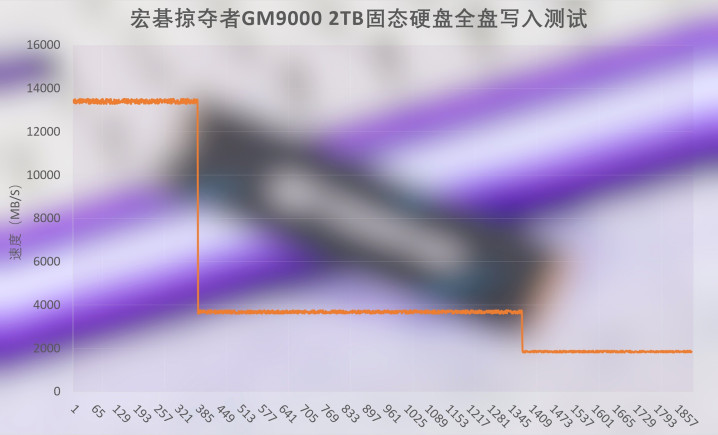 全盘连续写入测试,从写入曲线可见,宏碁掠夺者GM9000 2TB固态硬盘呈现出三段式写入速度,在空盘状态下SLC缓存空间约为380GB,此时的写入速度为13500MB/s,当SLC缓存空间耗尽后,写入速度会下降至3700MB/s,最后为GC回收阶段直至测试结束,此时写入速度为1800MB/s,全盘写入耗时不到十一分钟。